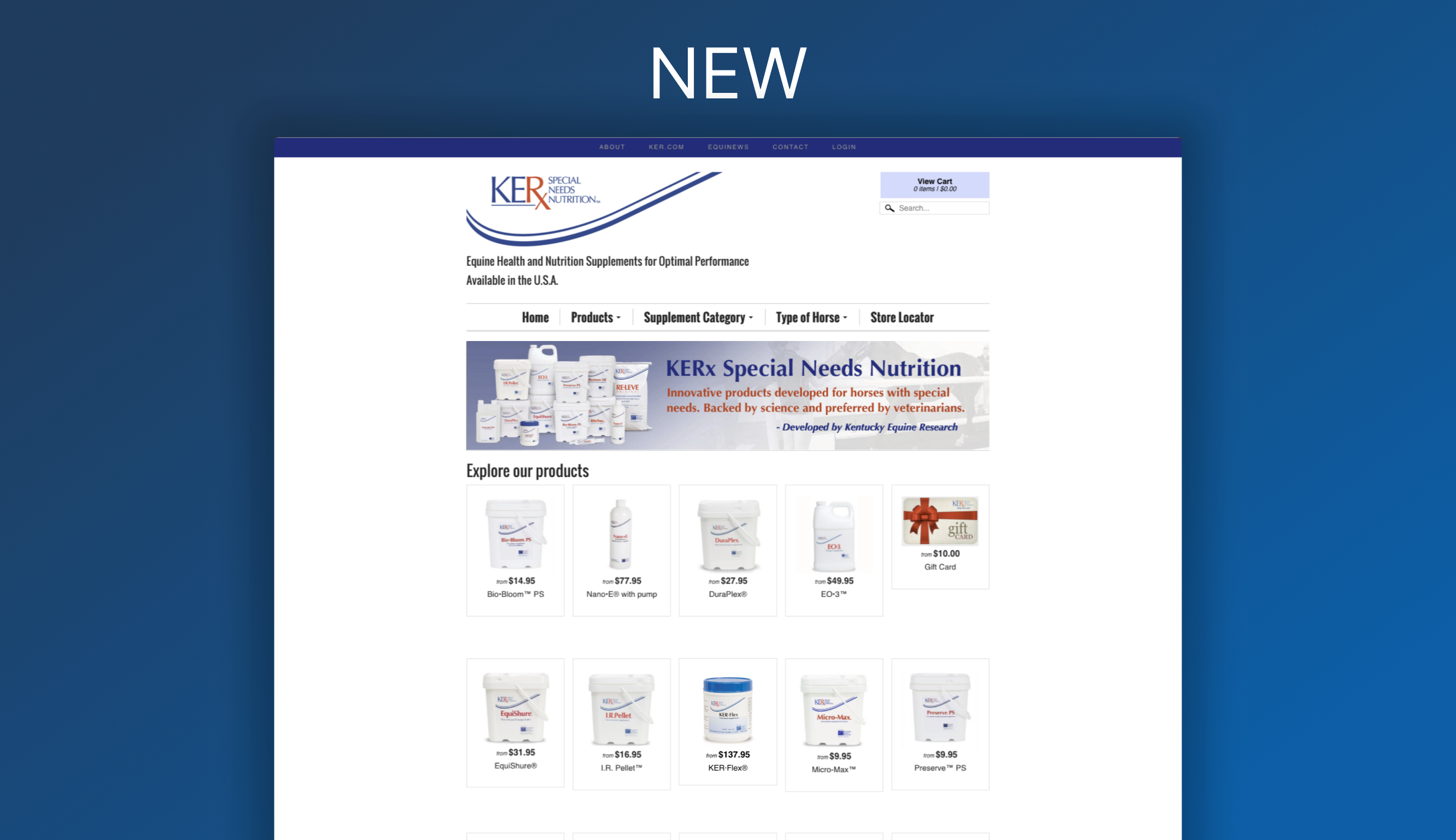• Clean, Intuitive UI: The new homepage features clear product categories (“Feeds”, “Supplements”, etc.) with descriptive images, making it immediately obvious where to find products. A prominent search bar with auto-suggest helps users jump directly to what they need. The overall aesthetic was updated to feel modern and credible – using high-quality photos of horses, a consistent color scheme, and clean typography – reinforcing KER’s professional image and heritage.