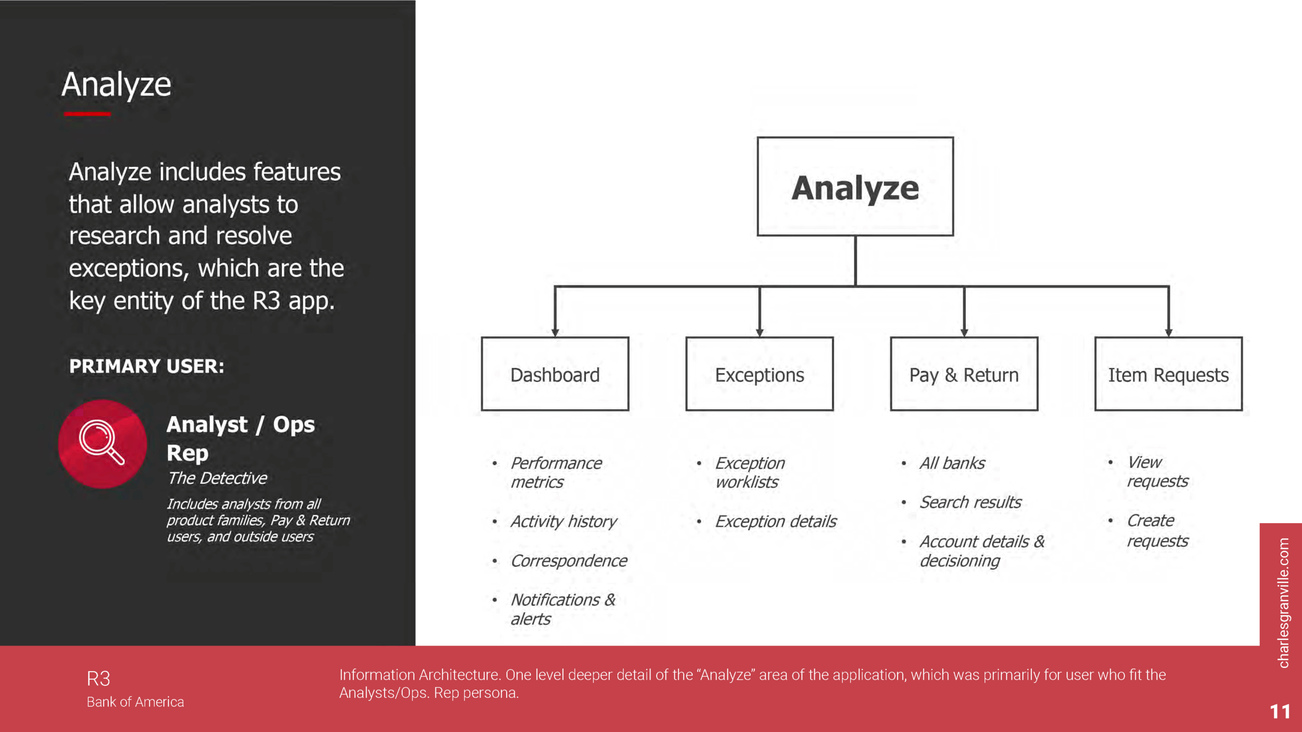 We created detailed personas from the groundwork research that identified the various roles and responsibilities in the spaces. Follow-ups research site visits were conducted to get additional data and further documents roles. Ultimately, we created a persona matrix that spaned hierarchy, skill-level, and space with the expectation that the persona fragmentation would combine as R3 simplified their process for resolving exceptions.